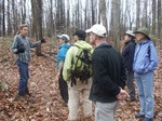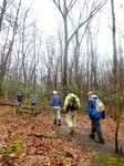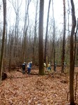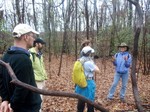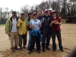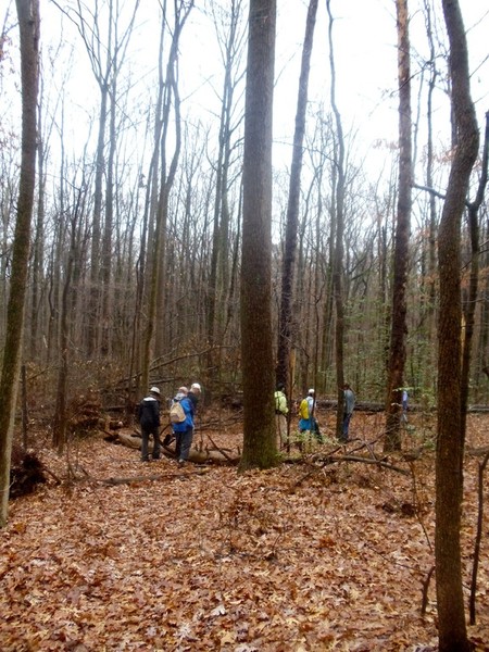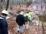 Eight hardy hikers braved the rain and mud to hike the full length of the preserve from Research Road to McDonald Field at Southway Road. Along the way, stories about saving the woods were shared, including how several acres behind Greenbelt Elementary School were bulldozed when the school was being built. Covering over four miles on the trails, hikers crossed over logs and streams, around the community gardens, and through the narrowest part of the preserve along the Baltimore Washington Parkway to reach MdDonald field. Down in the dugout, decorated for the occasion, hikers enjoyed hot chocolate, cookies and sandwiches before heading home.